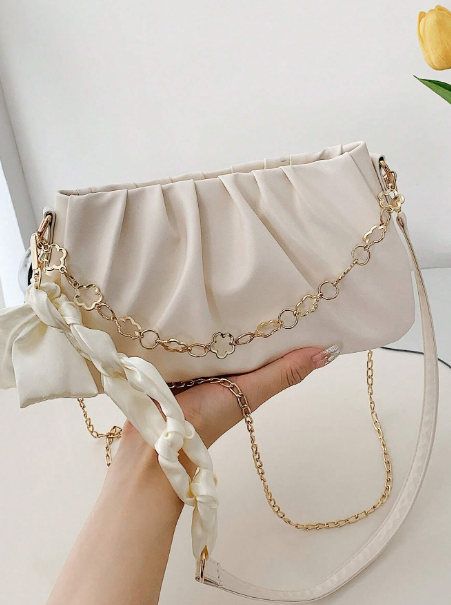 Elevate your handbag game with the Beige Ruched Bag Chain Twilly Scarf Decor from Shein. This accessory promises to add a touch of sophistication to your daily look and transform your bag into a stylish statement piece.